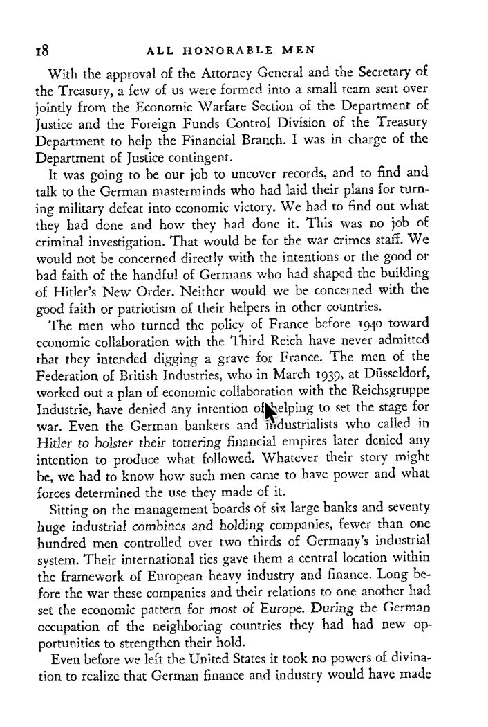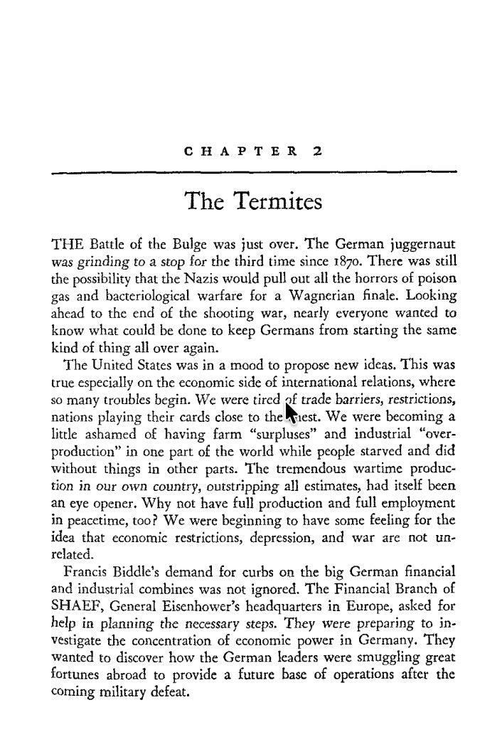 Prior to World War II, German industry was controlled by an elite group who had used their money and influence to help bring the Nazi Party to power. After the Allies had successfully occupied Germany and removed the Third Reich, the process of reconstructing the devastated nation’s economy began under supervision of the US government. James Stewart Martin, who had assisted the Allied forces in targeting key areas of German industry for aerial bombardment, returned to Germany as the director of the Division for Investigation of Cartels and External Assets in American Military Government, a position he held until 1947. Martin was to break up the industrial machine these cartels controlled and investigate their ties to Wall Street. What he discovered was shocking.