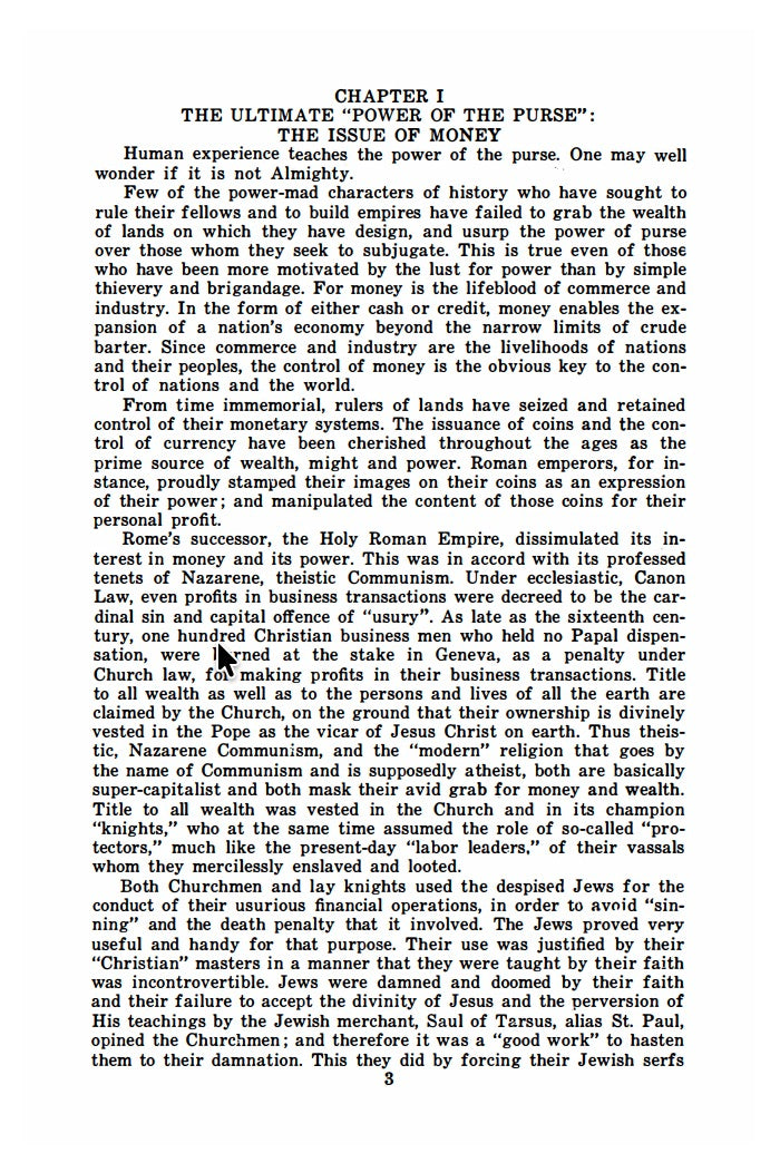"This is the story of the true-to-life prototype of Ian Fleming's Goldfinger. The truth, in this instance, is stranger, more menacing and frightening than fiction. The key figures pose as 'philanthropists' and are unsuspected. They use the U.S. and other governments, and kings and queens as pawns in their game. The presentation herein is largely based on statements of the conspirators and their press agents." - Preface. Argues that "the Rothschild-Vatican cabal of the nineteenth century has been replaced by a conspiratorial alliance of the Rockefellers, Jesuits, and Illuminists-Communists intent upon the dictatorship, genocide and enslavement of mankind." - Singerman