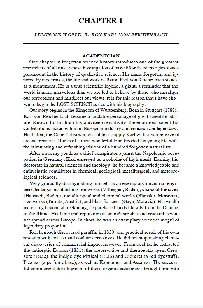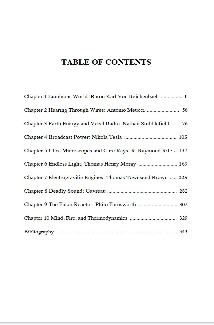 How did the aura research of Baron Karl von Reichenbach prove the vitalistic theory and frighten the greatest minds in Germany? How did the physiophone and wireless of Antonio Meucci predate both Bell and Marconi by decades? How does the earth battery technology of Nathan Stubblefield portend an unsuspected energy revolution? How did the geoaetheric engines of Nikola Tesla threaten the establishment of a fuel-dependent America?