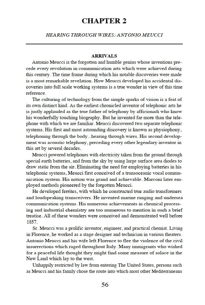 Read about the aura research of Baron Karl von Reichenbach, the wireless of Antonio Meucci, the controlled fusion devices of Philo Farnsworth, the earth battery of Nathan Stubblefield and more.