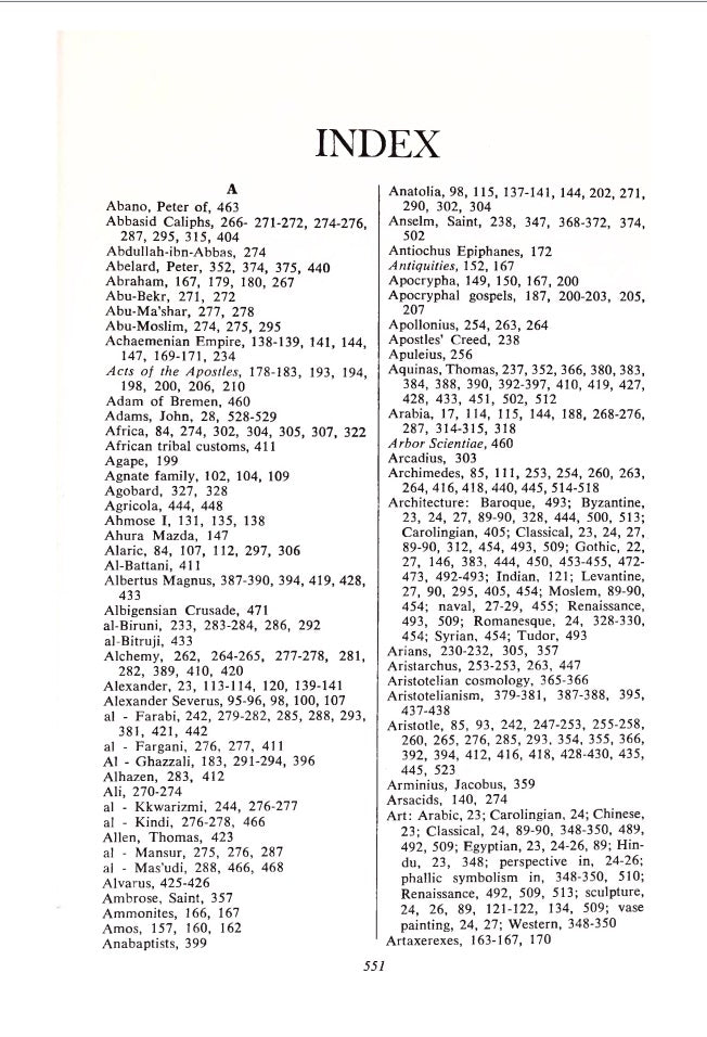 The intricate interrelationship of classical, Levantine and European cultures becomes its three pronged peg, then the problems of ethics reduced to ""survival"" moralities, a Biblical exegesis, the origins of Christianity and the Logos-Jesus, Aristotelian science, Arabic contributions, Carolingian conquest, utopianism, the 13th and 14th century mathematicians and physicists as the progenitors of the empirical tradition, the Renaissance and the Reformation movements each seeking authority for its revolt in the tradition of the early Levant, but neither knowing that this was their authority, misunderstandings about the rise and spread of Protestantism- all this, and much more, fill out the many, many pages, in what appears to be the first part of a bulky undertaking. Overstuffed, in some sections, oddly starved on others, this is an ultra de-luxe, if quasi-enigmatic, education.