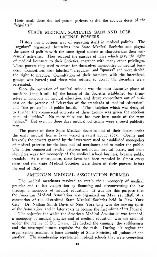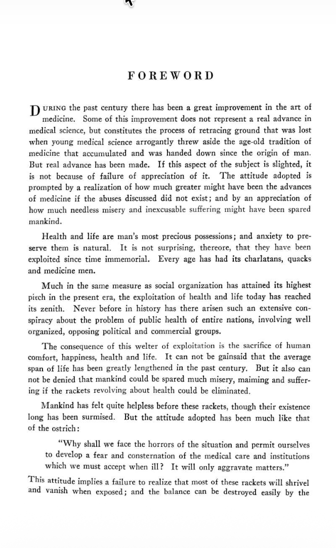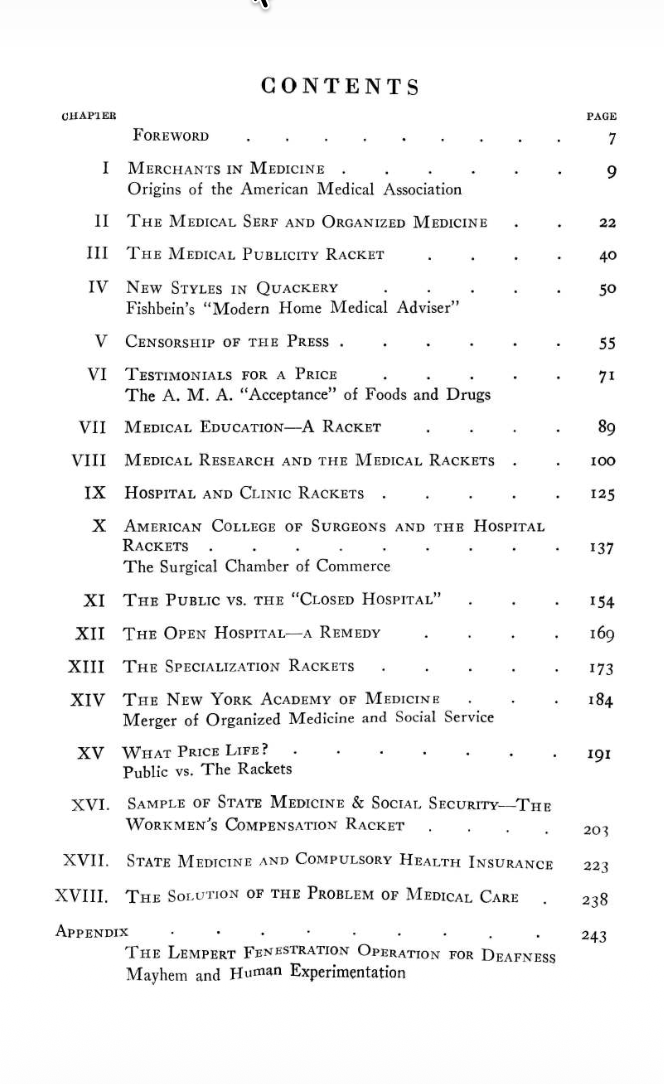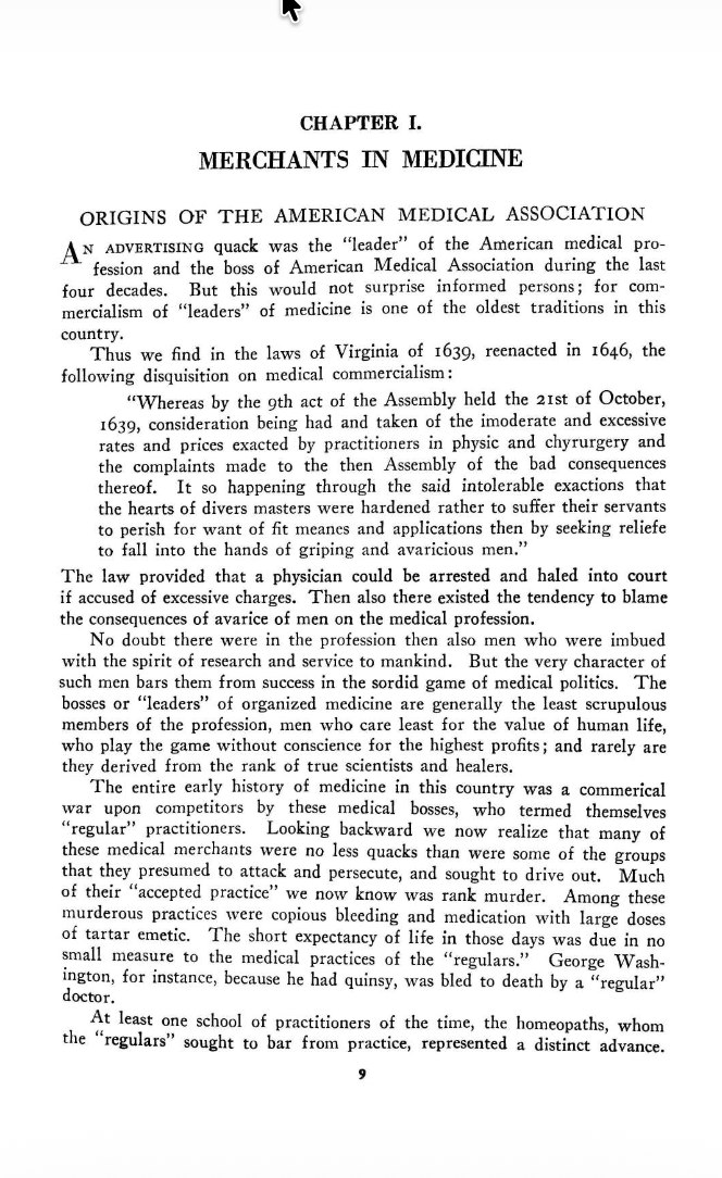 This book is a doctor's critique of medical monopolies and cartels that control every aspect of American health care. First published in 1941 and updated in the 1950's, Dr. Josephson shows that many problems with modern medine data to the early 20th century, when "Foundations", "Associations", and "Credentialing" bodies began to act as medical authorities, and interfere in every aspect of doctor-patient relations.